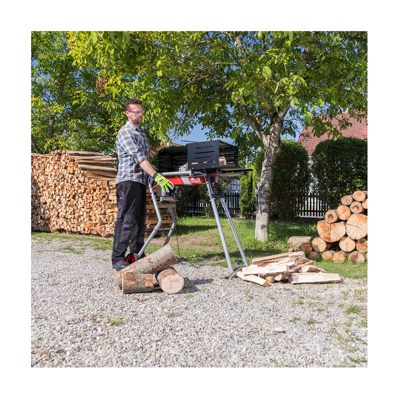 - Liegender Holzspalter mit bis zu 52 cm Spaltlänge und 5,0 t Spaltkraft