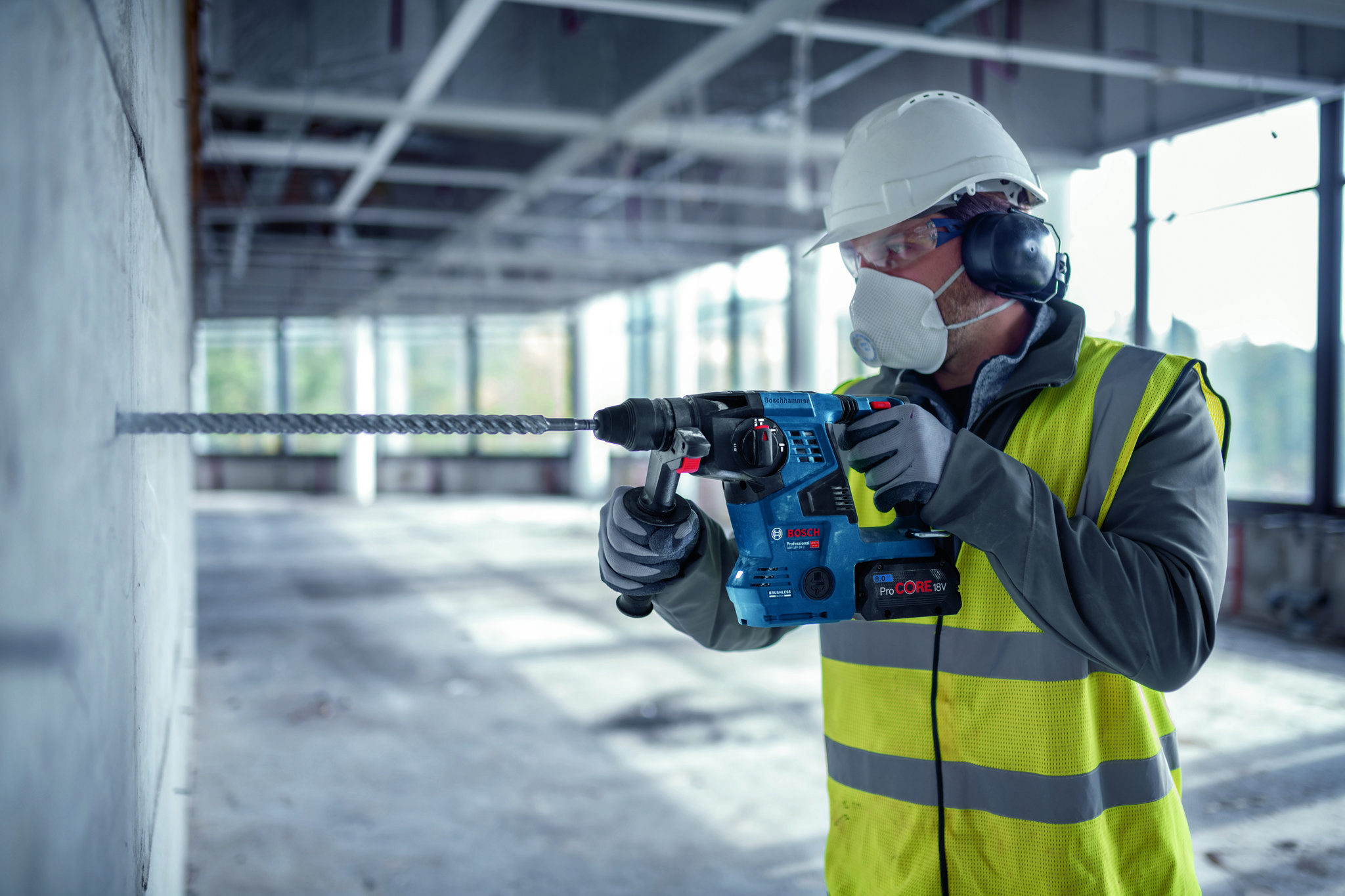 Der kabellose GBH 18V-28 C Professional von Bosch ist genau das Richtige für alle, die sich die Leistung eines kabelgebundenen Geräts bei kabelloser Freiheit wünschen. Dieser Bohrhammer verfügt über einen kraftvollen, bürstenlosen Motor der beim bewährten Schlagmechanismus für eine Schlagenergie von 3,3 J sorgt. Das leicht ablesbare User Interface zeigt den Werkzeugstatus an und erlaubt dem Anwender die Auswahl zwischen drei verschiedenen Betriebsarten (Auto, Favorite, Soft) für perfekte Kontrolle bei jeder Arbeit. Mit dem eingebauten Bluetooth-Modul (GCY 42) kann sich der GBH 18V-28 C mit der Bosch Toolbox App für weitere, individuell an den Anwenderbedarf angepasste Einstellungen verbinden. Vibration Control, KickBack Control und Kompatibilität mit der GDE 18V-16 für staubfreies Bohren sorgen für umfassenden Anwenderschutz.