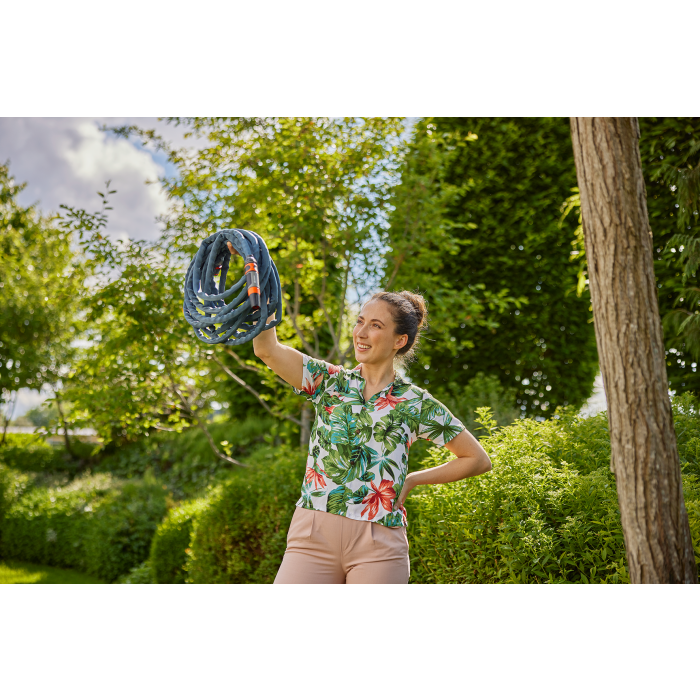 Das Textilschlauch Liano Xtreme 15 m Set mit Aufbewahrungstasche von GARDENA ist sofort einsatzbereit und optimal für lange und anspruchsvolle Bewässerungen. Mit einer Länge von 15 m und einem Durchmesser von 13 mm (1/2") ist der robuste Textilschlauch bestens für kleinere Gärten geeignet. Neben dem Liano Xtreme umfasst das Set die vormontierten Original GARDENA Systemteile Liano Wasserstop sowie Liano Schlauchverbinder, eine Reinigungsspritze, die Aufbewahrungstasche und zwei Hahnverbinder. Durch das Reduzierstück in einem der beiden Hahnverbinder ist der Anschluss an insgesamt drei Hahngrössen möglich. Dank des sehr flexiblen PVC-Innenschlauches und des innovativen Aussenschlauches aus extrem widerstandsfähigem Textilgewebe ist der Liano Xtreme elastisch sowie langlebig und bietet eine herausragende Performance. Herausforderungen wie Pflastersteine, Rosendornen oder das Manövrieren entlang von Hauswänden bewältigt er mit Leichtigkeit. Der schmutzabweisende Textilschlauch verknickt nicht und bleibt nicht an Hindernissen hängen. Da er bis zu 50 % leichter als herkömmliche PVC-Schläuche ist, bleibt die Handhabung auch über einen längeren Zeitraum angenehm. Aufgrund der guten Haptik liegt er stets komfortabel in der Hand. Die Aufbewahrungstasche mit gelungenem Design vereinfacht den Transport und die platzsparende Lagerung des Textilschlauches im Regal oder in der Garage. Ihr Belüftungsschlitz dient zum Entweichen von Feuchtigkeit und sie verfügt über einen wasserdichten Boden. Die beiden Seitentaschen sind ideal zur Unterbringung von Schlauchzubehör wie zum Beispiel der Reinigungsspritze. Zusätzlich überzeugt der Textilschlauch mit einem Berstdruck von 35 bar sowie UV- und Frostschutz. Das ermöglicht einen ganzjährigen Einsatz. Der schadstofffreie Textilschlauch ist frei von Phthalaten (0,1%) sowie frei von Cadmium, Blei und Barium (0,1%). Der Textilschlauch Liano Xtreme ist ein Qualitätsprodukt Made in Europe mit einer langen GARDENA Herstellergarantie von 30 Jahren nach einer Online-Registrierung.