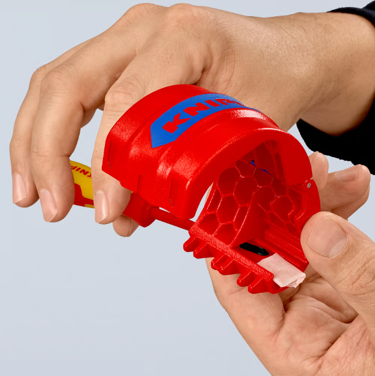 Der Knipex BiX ist ein kompaktes Schneidewerkzeug für unverstärkte Kunststoffrohre und Tropf-/Dichthülsen. Dank dem drehbaren Messerblock schneidet es Rohre mit Durchmessern von 20–50 mm und Wandstärken bis 2,4 mm präzise und spanlos. Es ist leicht (108 g), handlich (72 mm) und ideal für enge Arbeitsumgebungen.