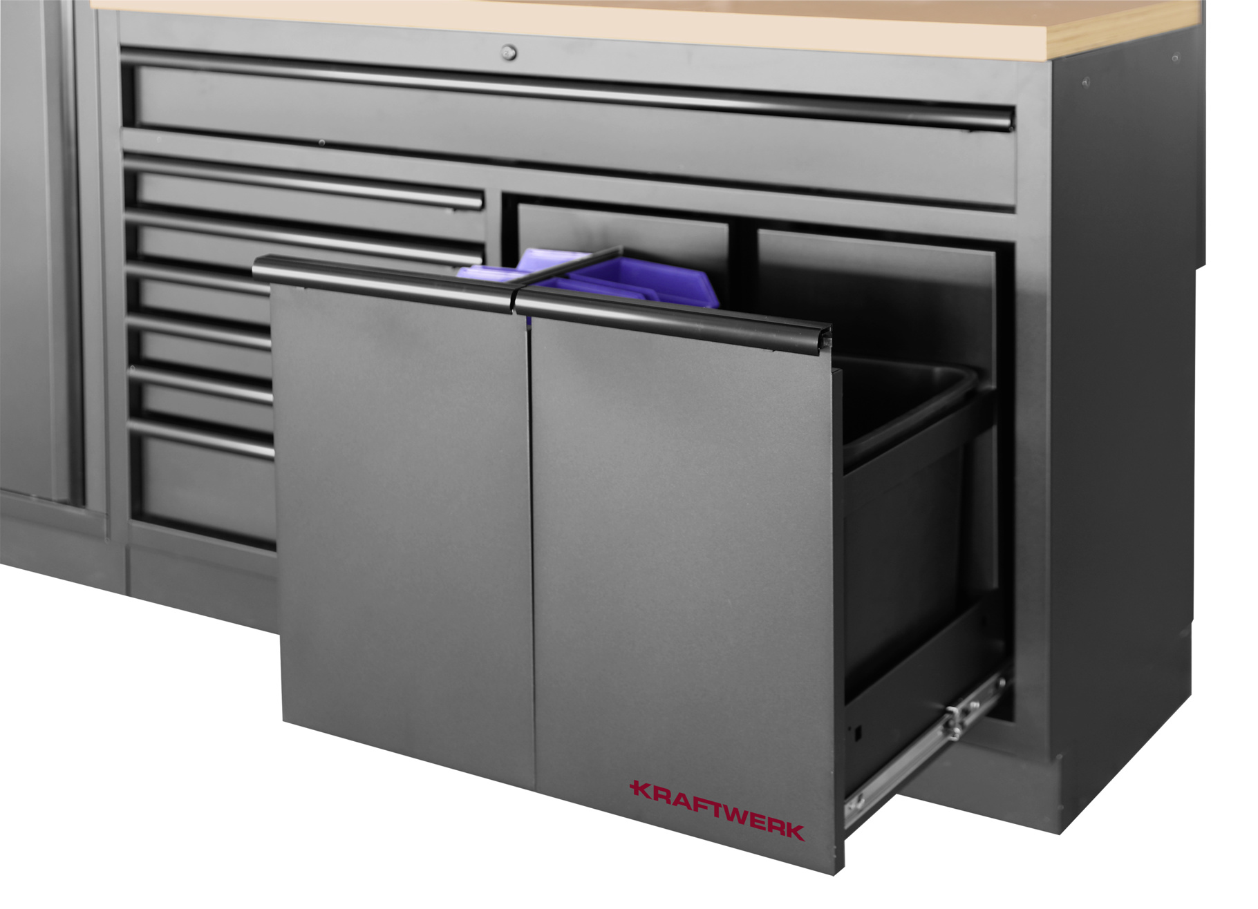 Mit der MOBILIO BLACK 4er Unterschrank-Kombi von KRAFTWERK erhältst du eine durchdachte und vielseitige Aufbewahrungslösung für deine Werkstatt. Sie umfasst insgesamt 17 Schubladen, einen geräumigen Schrank sowie eine robuste Arbeitsplatte aus Buche-Multiplex. Alle Elemente – mit Ausnahme der Arbeitsplatte – sind in elegantem, zeitlosem Schwarz gehalten. Dank der freistehenden Bauweise kannst du die Kombination flexibel platzieren, ohne feste Verankerung – genau so, wie es am besten zu deinem Arbeitsplatz passt.