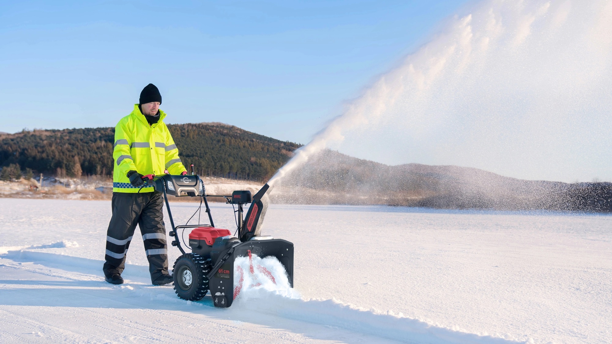 Die 82SN61 ist mit einem zweistufigen Wurfsystem mit gehärtetem Stahllaufrad ausgestattet, das den Schnee in den vorderen Teil der Maschine zieht, und die hocheffiziente Schnecke wirft den gesammelten Schnee über den Auswurfschacht aus. Dank der verschiedenen Drehzahlen kann bis zu einem halben Meter tiefer Schnee mühelos auf eine Entfernung von 15 m geworfen werden, was eine hohe Produktivität unter allen Bedingungen ermöglicht. Die Schneefräse ist dank der zwei unabhängigen Radnabenmotoren, die über zwei Handhebel gesteuert werden, sehr einfach und flexibel zu fahren.