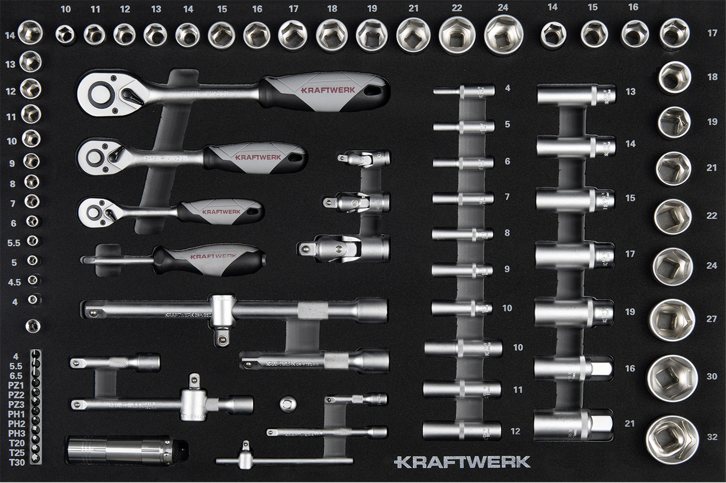 • 1/4" Steckschlüsseleinsätze: 4 - 4.5 - 5 - 5.5 - 6 - 7 - 8 - 9 - 10 - 11 - 12 - 13 - 14 mm