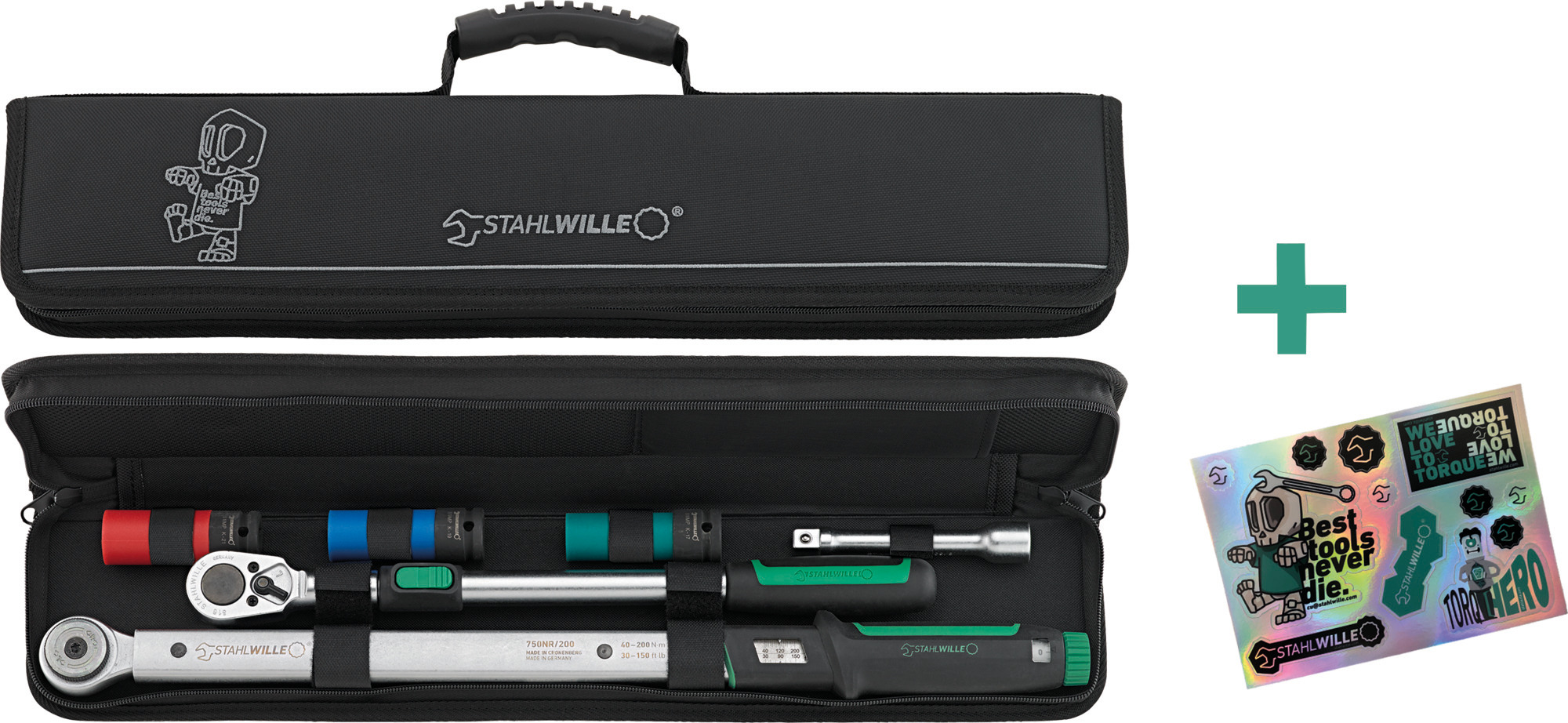 • Dank der integrierten Teleskopfunktion lässt sich durch den verlängerten Hebelarm das erforderliche Drehmoment besonders leicht erreichen. Geliefert wird das Set in einem handlichen Softcase mit hochwertig eingesticktem Sondermotiv der Best tools never die-Edition.