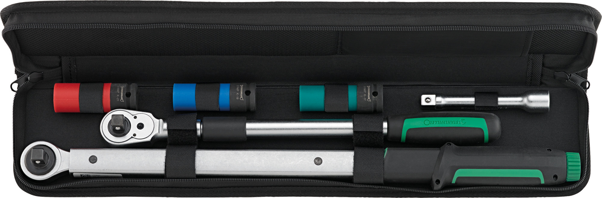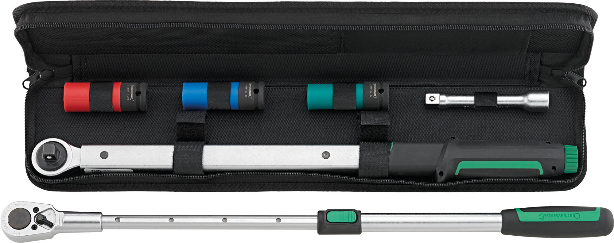• Das Set ist mit einem SevenFiveZero-Drehmomentschlüssel mit 1/2" Feinzahnknarre ausgestattet und umfasst drei Radmuttern-Steckschlüsseleinsätze in den Grössen 17, 19 und 21 mm mit Kunststoffhülse. Diese bieten einen maximalen Schutz für empfindliche Leichtmetallfelgen. Beim Erreichen des eingestellten Auslösemoments ist ein deutlich hör- und fühlbarer „Klick“ wahrnehmbar. Die Einstellung erfolgt komfortabel und präzise über einen Drehknopf am Griffende, wobei eine Umdrehung 10 N·m entspricht.